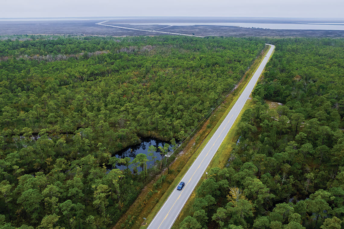 Highway 12 passes through acres of forest in Cedar Island National Wildlife Refuge. photograph by Chris Hannant