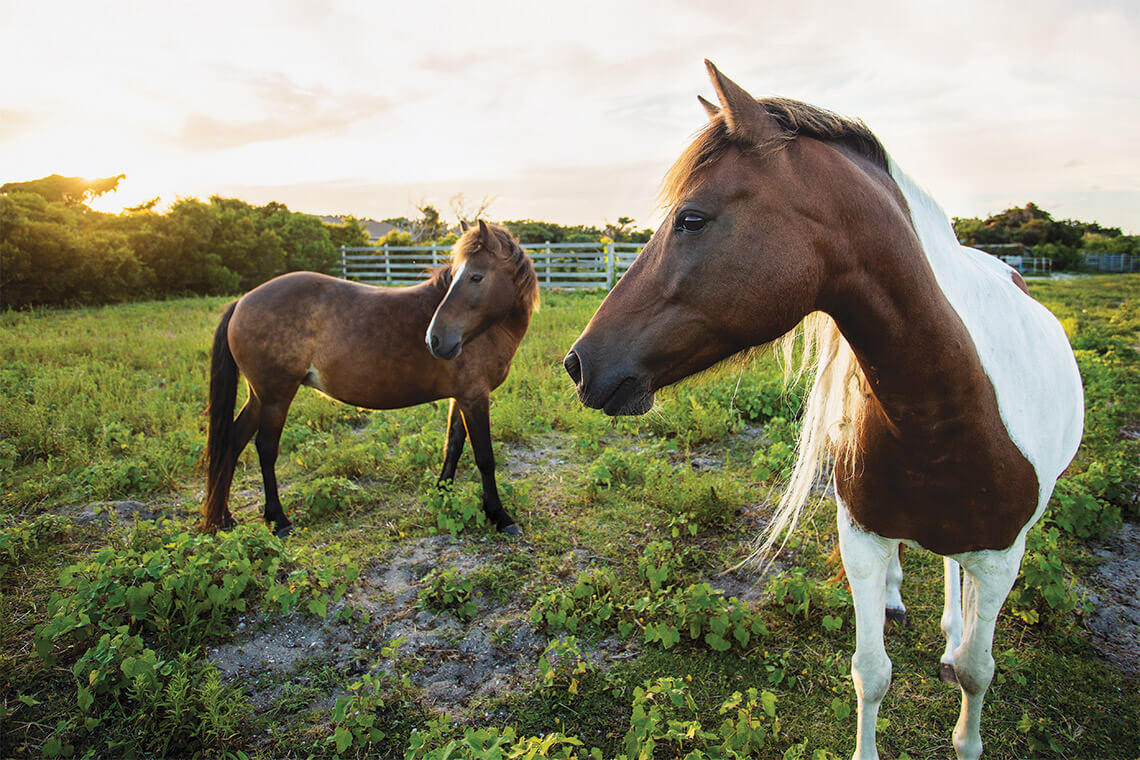 “Banker ponies” — which are actually descended from shipwrecked colonial Spanish mustangs — once roamed free on Ocracoke Island. To protect them from vehicles on Highway 12, 188 acres of soundside beach and marsh were enclosed in 1959, and the ponies have been cared for by the National Park Service ever since. A viewing platform overlooks their paddock and stables, and the 15 or so horses that call the island home.