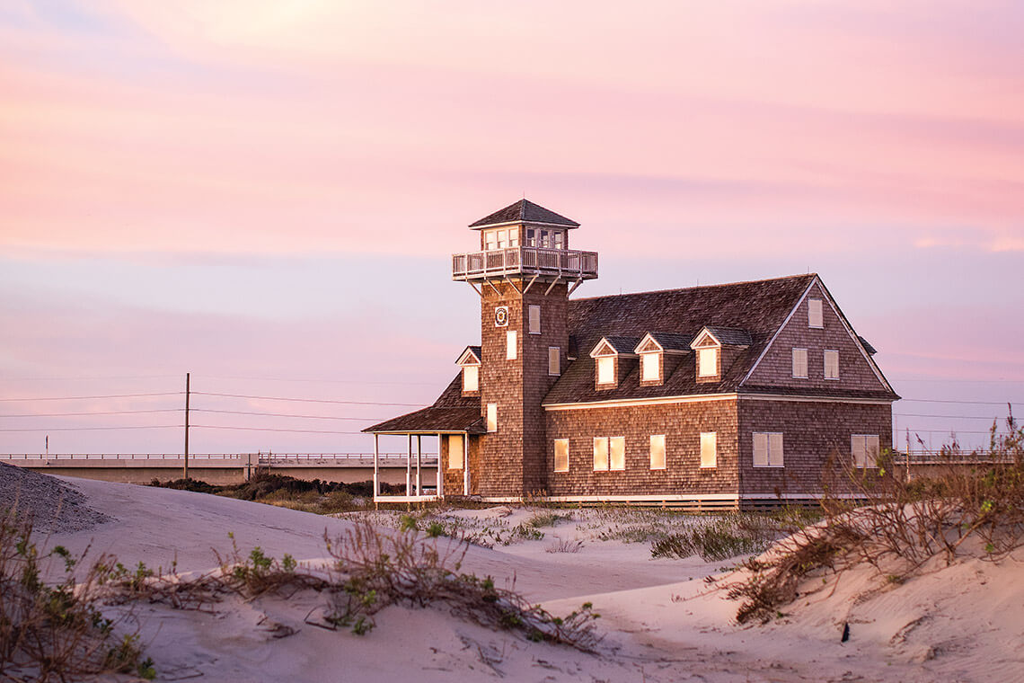 The Oregon Inlet Life-Saving Station offers a pretty picture at sunset. photograph by Chris Hannant