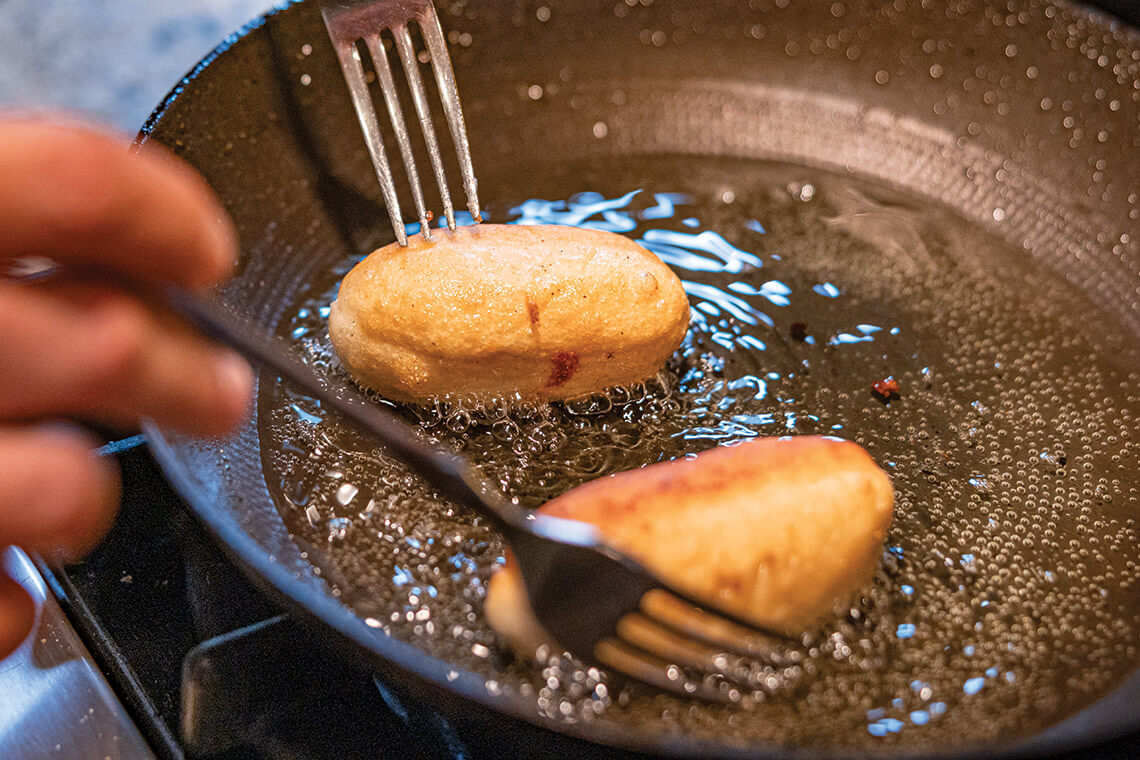 … then pan-fries them in oil.<br><span class="photographer">photograph by Charles Harris</span>