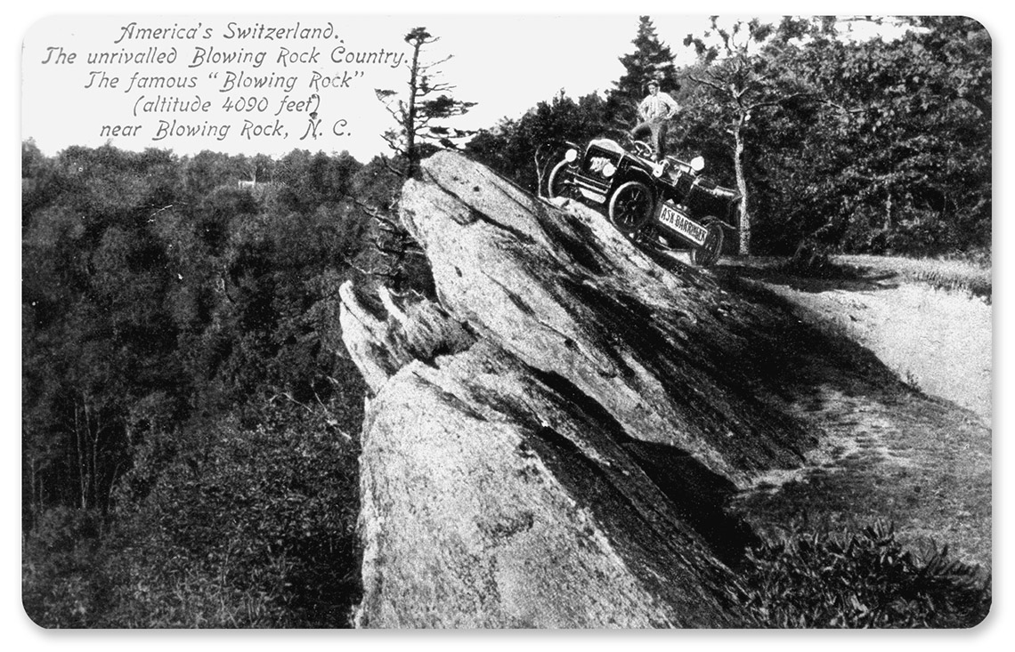 Those early photos in the gallery attest to the precarity: folks teetering from the rock, perched in the troposphere, taking mad chances for immortality, one false step from kingdom come. There’s an unforgettable daredevil shot of a chap, hands intrepidly on his hips, standing on what seems to be the seat of an early 20th-century automobile, perhaps a Pierce-Arrow. The car is parked astonishingly at 45 degrees on the rock itself. This very image appears in Donna Akers Warmuth’s Blowing Rock, part of the Images of America series. It’s actually an antique postcard, with a 1910 postmark and a headnote in the upper left corner: “America’s Switzerland. The unrivalled Blowing Rock Country. The famous ‘Blowing Rock’ (altitude 4090 feet) near Blowing Rock, N.C.”