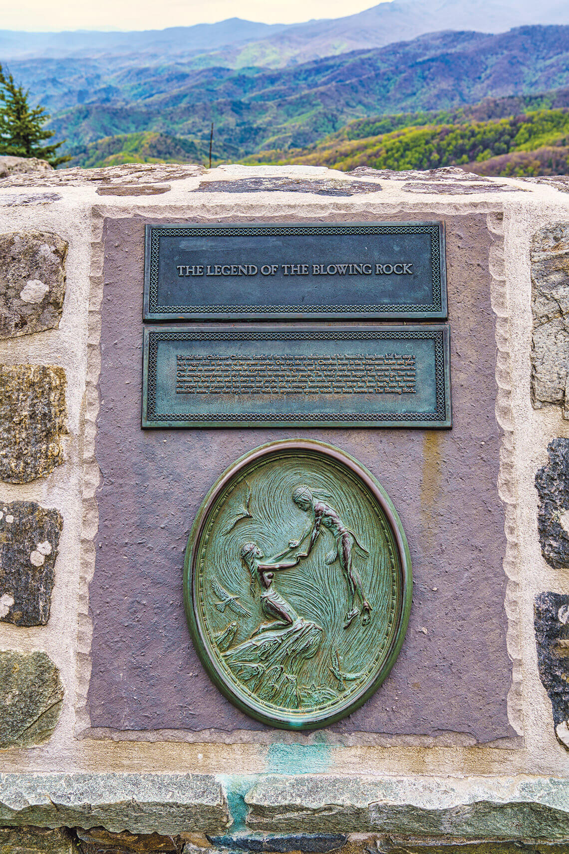 According to the legend of The Blowing Rock — said to be recorded in the 1800s and preserved in bronze near the rock itself — gusting winds reunited two lovers when one leapt into the gorge. photograph by DANIEL WILSON/ALAMY STOCK PHOTO