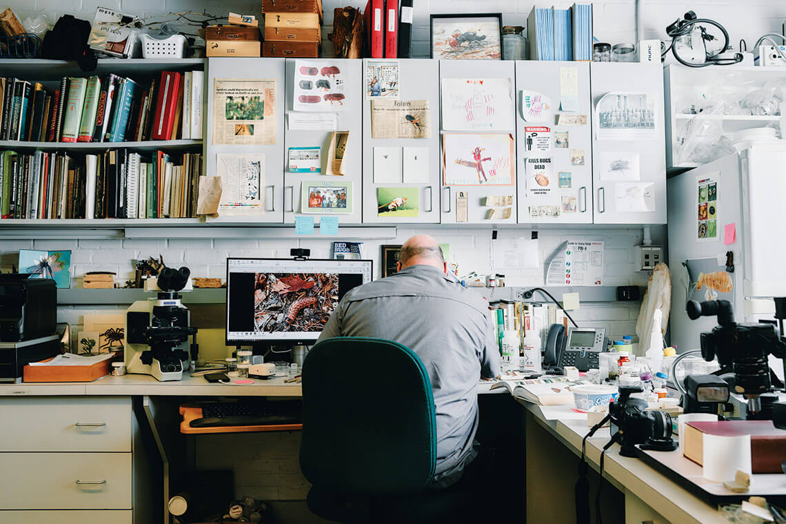 At his workstation at NC State, Bertone is surrounded by the tools of his trade: specimens, books, cameras, microscopes, and drawings of bugs from young citizen scientists across the state. photograph by Joshua Steadman