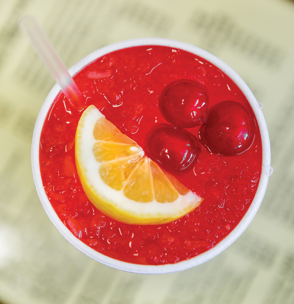 The window unit hums like a generator. A newspaper sits on the counter for anyone eating alone. The TV sports rabbit-ear antennas, and the customers sport tattoos and high heels, baseball caps and business suits. A waitress delivers a Cherry Lemon SunDrop, a drink whose hue appears nowhere in nature and whose ingredients, naturally (or not), are SunDrop, cherry juice, candied cherries, lemon slices, and lemon juice. “Y’all be good,” she calls to a customer leaving with his bag of burgers. “They don’t know how,” another waitress retorts.