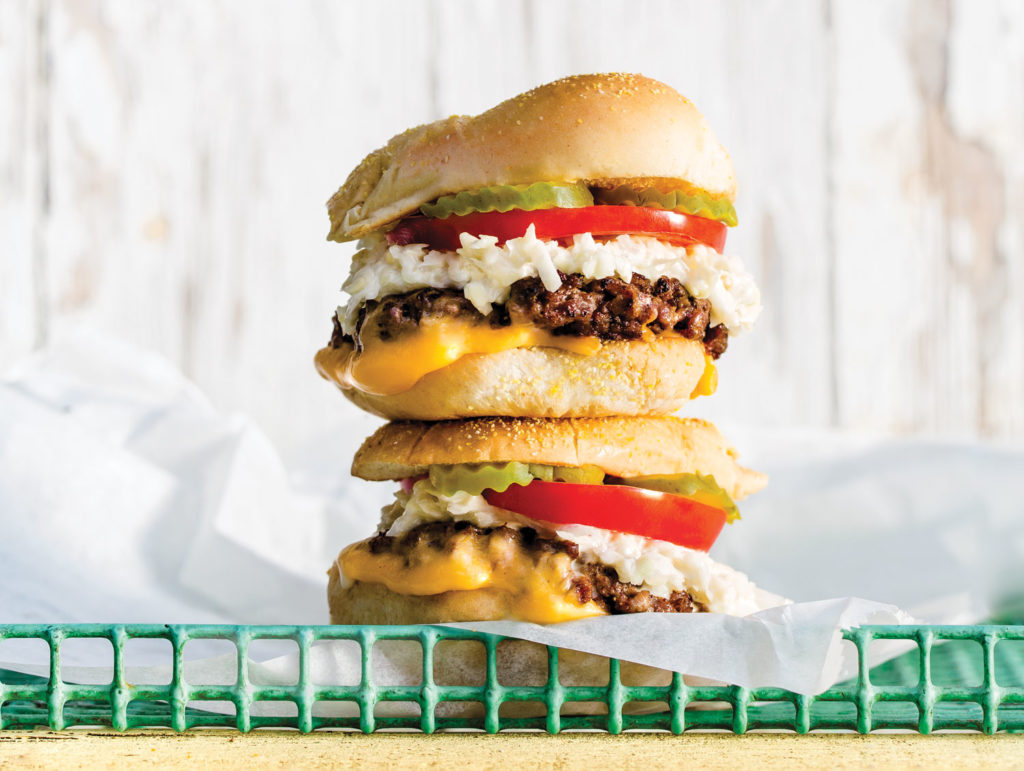 The Shake Shop’s signature meal, a Lottaburger, is stacked with slaw, tomato, and pickle. photograph by Tim Robison