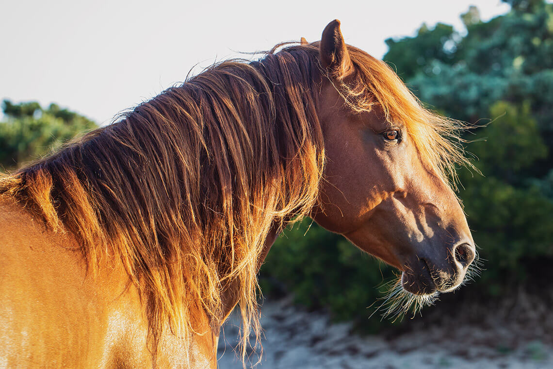 Chestnut stallion Capt. Marvin Howard — “Captain” for short — is one of two stallions in the herd. In 2018, he sired the herd’s youngest horse, Winnie, with Sacajawea. photograph by Chris Hannant