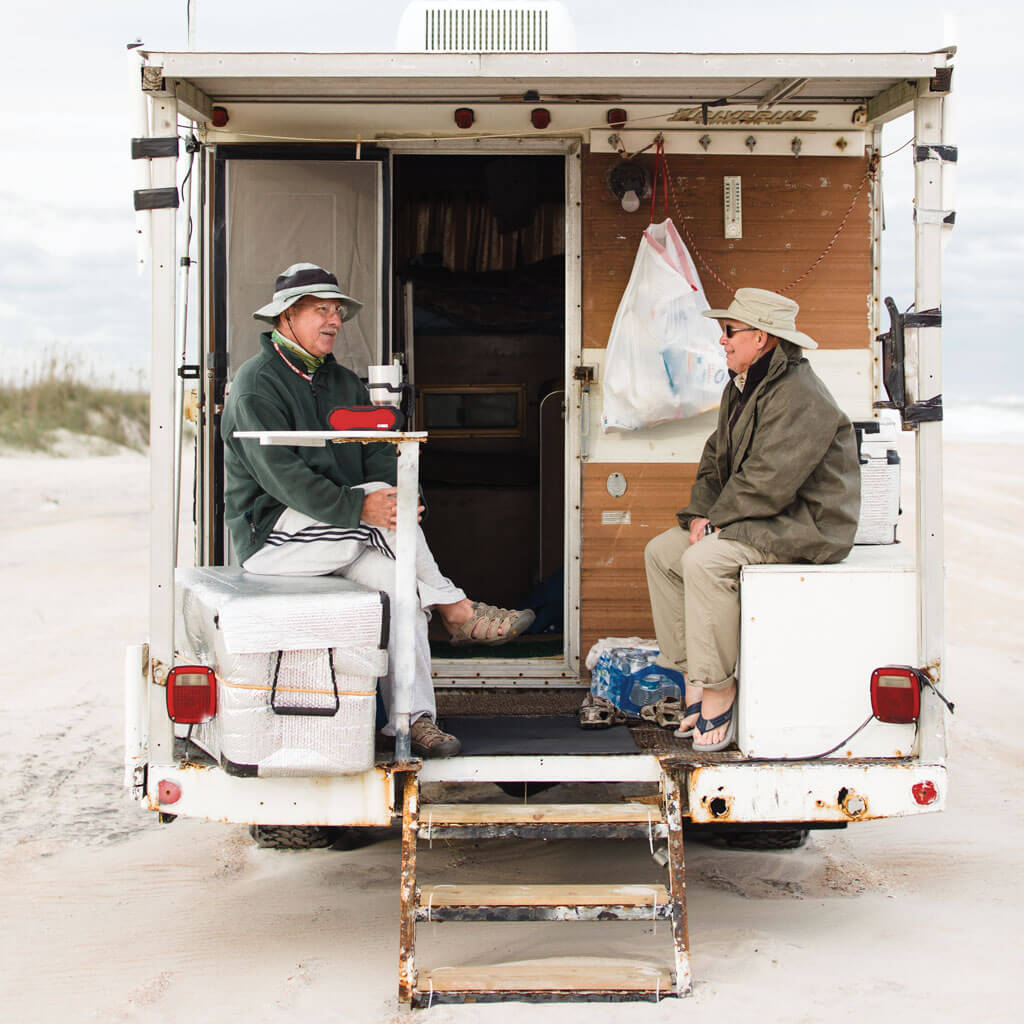 Doug Hink (left) and Jeff Finkbeiner co-own their rusty orange RV. They claim that it’s the oldest one on the beach. And they might be right — but folks are too busy catching fish to keep records. photograph by Baxter Miller