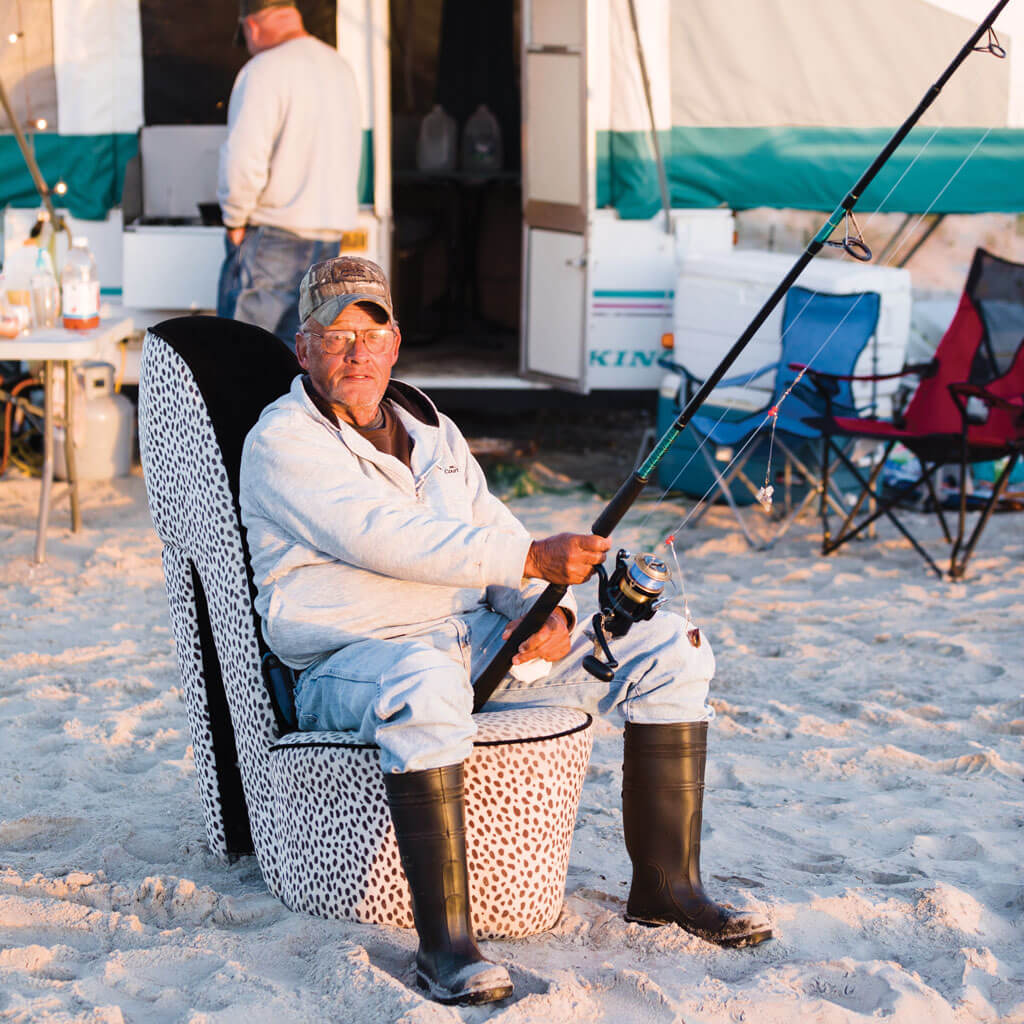 This surf fisherman from Rowan County comes to Davis Island with his friends for the red drum run every year. Whoever catches the most fish wins the “trophy” of sitting on the high-heel chair. photograph by Baxter Miller