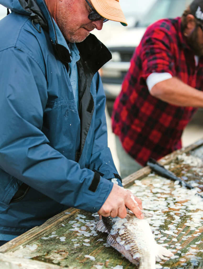Charlotte-area fishermen scale puppy drum they’ve just caught. Dinner will be a South Core Banks feast by the fire. photograph by Baxter Miller