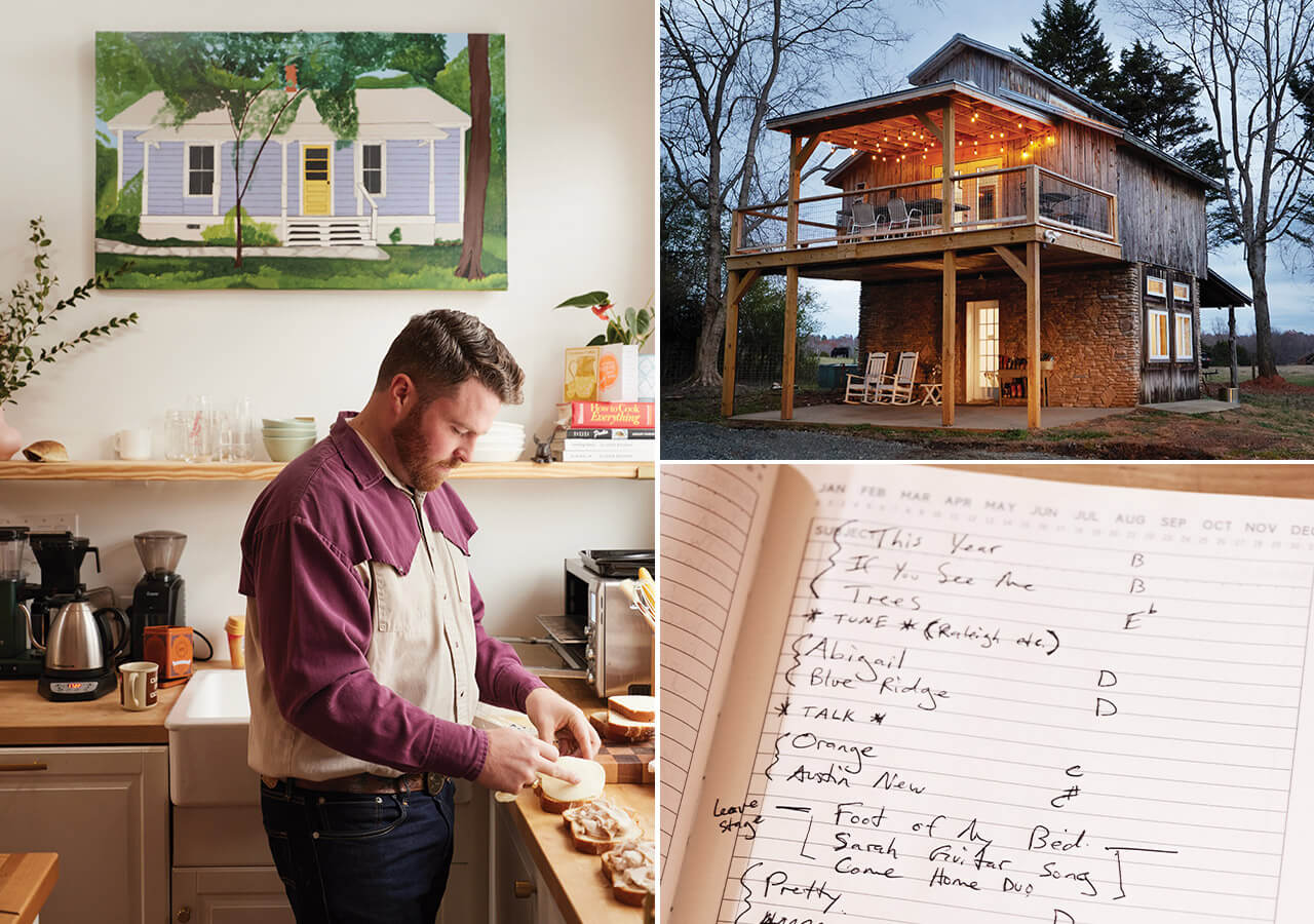 On the kitchen wall of the McCombies’ temporary garage apartment — where Austin prepares sandwiches and Sarah scribbles out the duo’s concert set lists — is a painting of their previous house in Chatham County. photograph by Alex Boerner