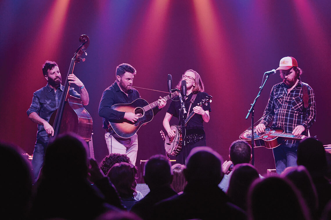 Sarah McCombie might as well be on her front porch, casually chatting with a gaggle of her closest friends. Only this front porch is the Lincoln Theatre in Raleigh — and there are about a thousand friends hanging onto her every wry word. At first glance, she seems too slight to command the sold-out crowd, standing center stage in a simple, old-fashioned dress, peering through spectacles, placidly tuning her banjo as she speaks. And yet the audience leans in to listen closely to the 29-year-old singer with chestnut tresses, fast eyes, and a quick smile. They adore the stories that she croons along to the picking of her guitar-playing husband, Austin.