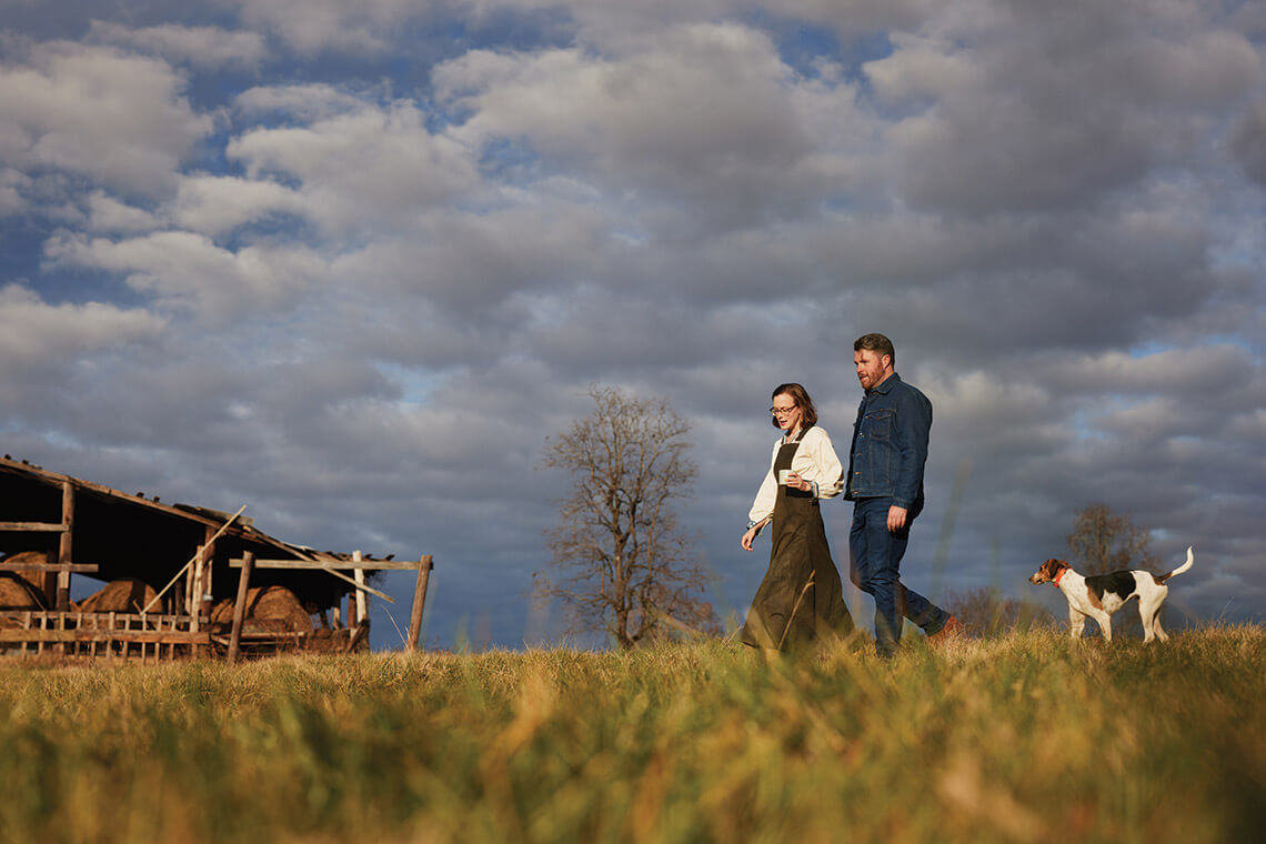 The McCombies’ foxhound, Opal, follows the couple on strolls around their 64-acre farm in Guilford County. <br><span class="photographer">photograph by Alex Boerner</span>