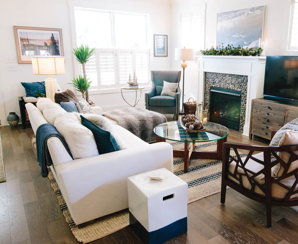 Before they’d even found their home, Mike and Erin Toste were set on their house color: blue. The native Californians who made their way to North Carolina — Mike’s a real estate agent in Lake Norman — have a penchant for the color of sea and sky. Even their 4-year-old boxer, Dana, sports their favorite color around his neck.
