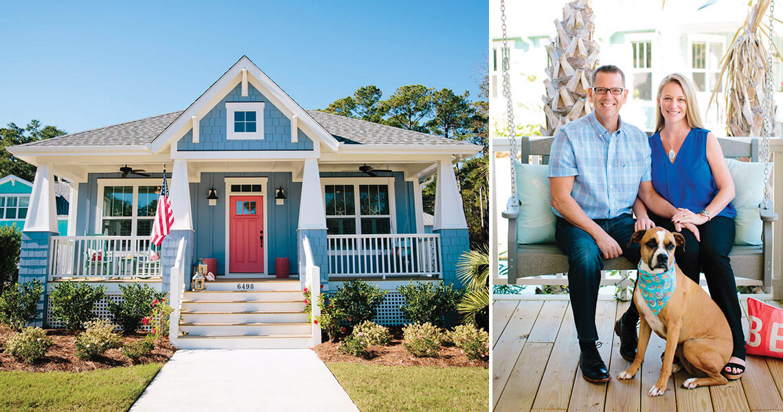 Here, in the easygoing neighborhood called The Cottages at Ocean Isle Beach, every home, custom-built to resemble Craftsman-style cottages from the 1920s, features a wide, welcoming front porch. Palmetto trees line the sidewalks; a communal firepit surrounded by Adirondack chairs encourages conversation. Blue hydrangeas and pink rose bushes complement the tropical hues of the houses.