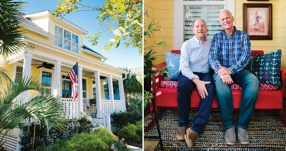 Mark Ballard and Tom Finney at their home in Ocean Isle Beach. They chose the Waterside plan. The sunny yellow exterior of their home is Benjamin Moore’s Golden Honey. photograph by Matt Ray Photography