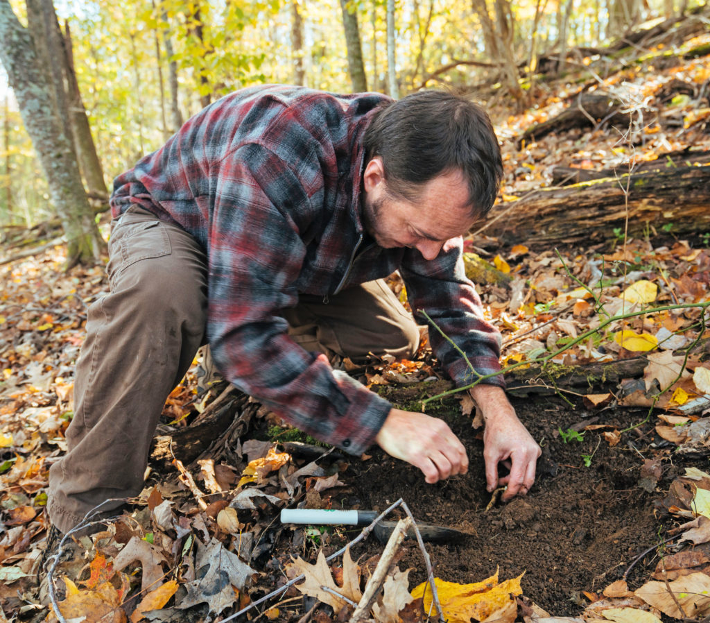 It’s September, mid-digging season, and ginseng leaves have already started to turn. At the farm, he braves a patch of poison ivy to lean his backpack against a tree trunk. Then, he gets to work, pushing back a blanket of pine needles.
