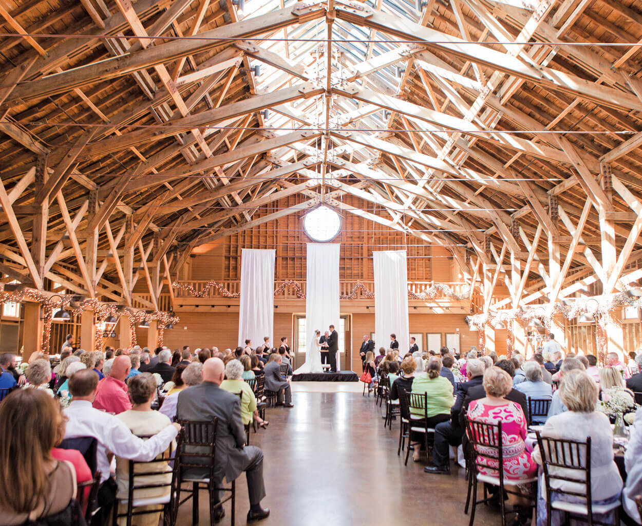 A skylight runs the entire length of the Fair Barn’s roof, providing weddings and other events with ideal natural lighting inside the 7,000-square-foot space. photograph by Jamie Blow