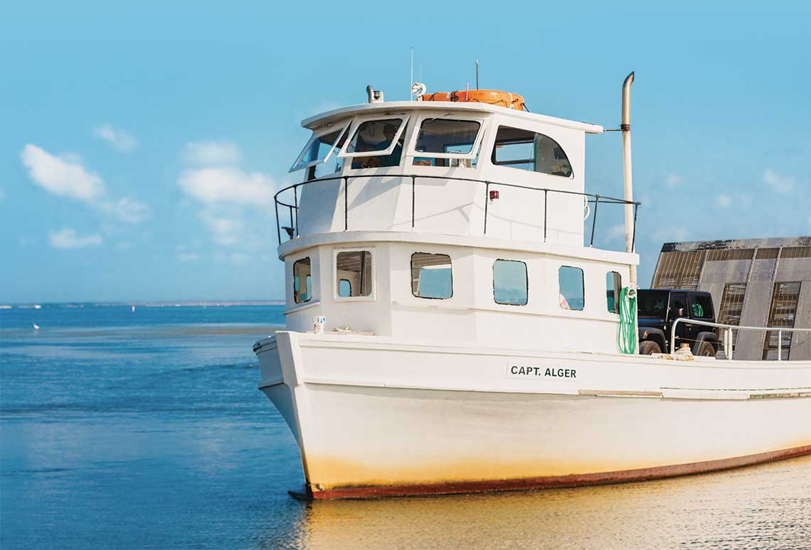 The 51-foot, 35-ton ferryboat Capt. Alger was named for Alger Willis Sr., one of the first seamen to run a vehicle ferry from Davis to South Core Banks in the late ’50s, when he started his fishing camps. photograph by Baxter Miller
