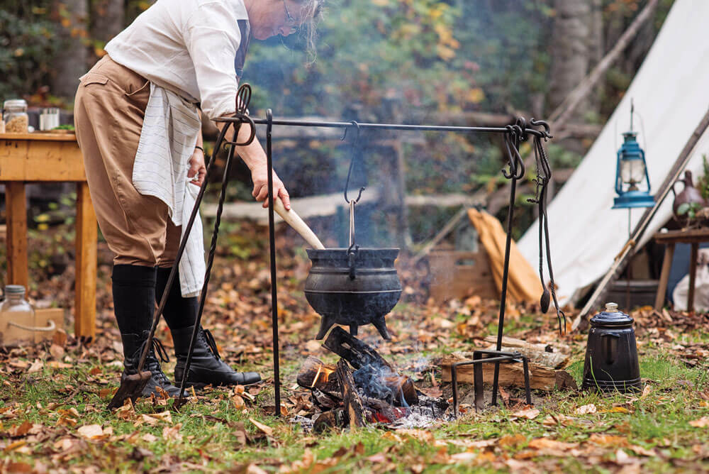Soup’s on: Acorn Patrol member Eve King stirs a bean soup with foraged herbs in a cast-iron South African-style “potjie.” Acorn bread, drop biscuits, and churned butter accompany the meal. The coffee pot stands ready for Williams’s Dutch-oven pie, which he bakes in hot coals later in the evening. photograph by Jack Sorokin