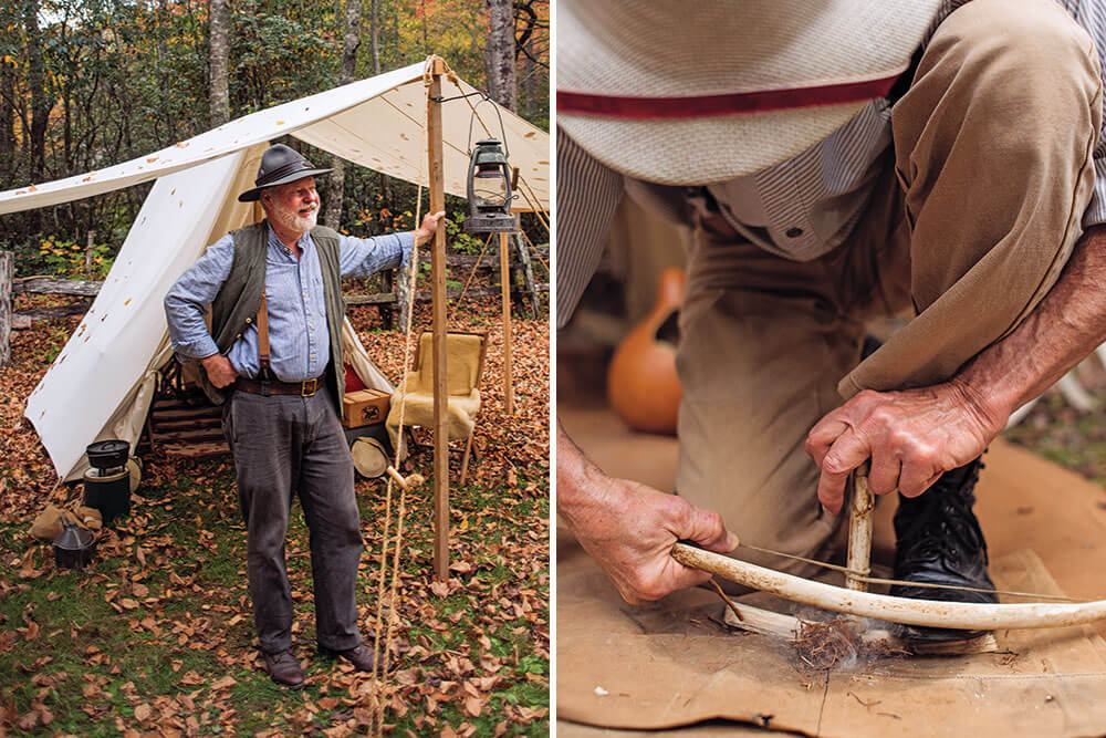 Just as it was a century ago, a wedge tent (left) is roomy and durable. ASU professor emeritus Wayne Williams keeps a kerosene lantern hooked to his. At Tom Mancke’s campsite, a bow drill is put to good use. Both were vital in camping’s golden age. photograph by Jack Sorokin