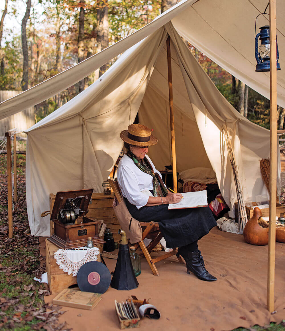 Over a tent dubbed the “Macke Mansion,” a Victrola warbles an oldie, while the lady of the tent, wearing her suffragette sash, sits in the shade of a raised tent flap, sketching a leaf. Jennifer Mancke and her husband, Tom, are members of the Acorn Patrol and have come to this gathering in Pisgah Forest bearing all the trappings of a middle-class campsite — the kind, say, a 1918 shopkeeper couple might share.