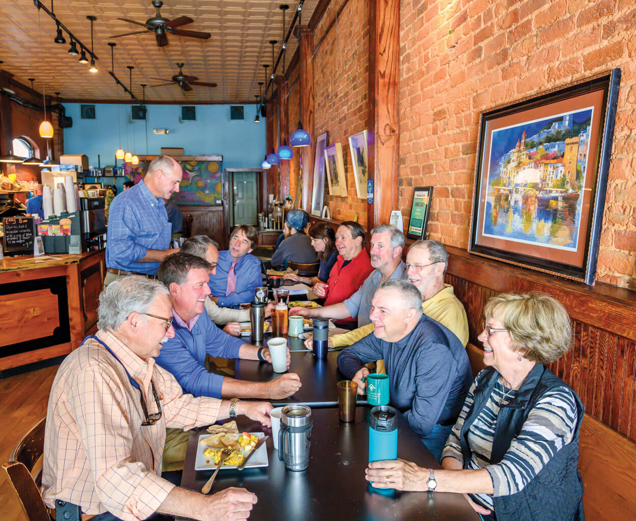 On Friday mornings, you’ll find members of Morganton’s Coffee Club gathered around a table inside Grind Cafe. photograph by C2 Photography