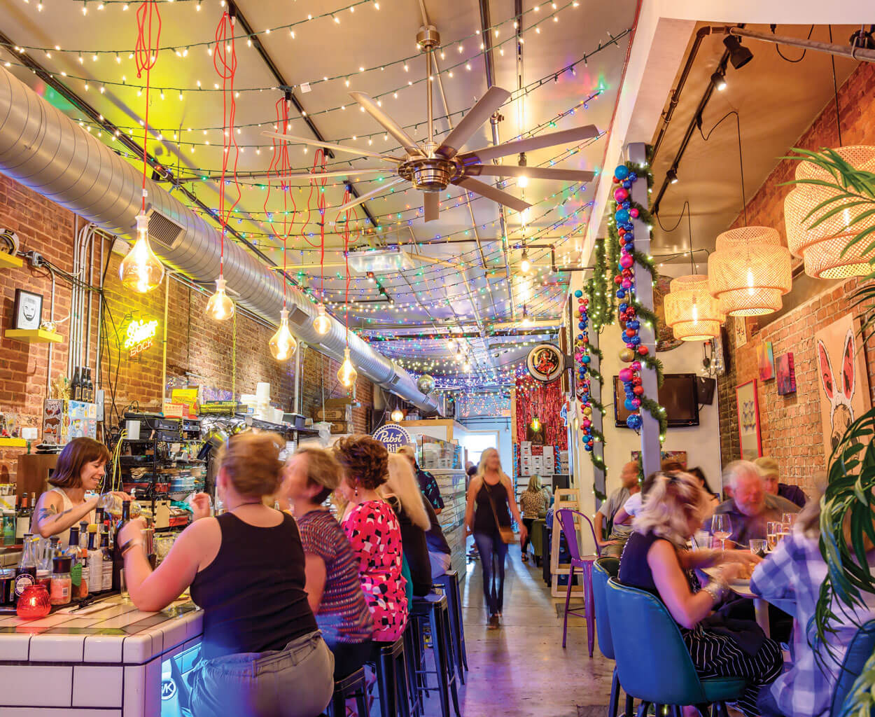 At Homer’s Soda Shop — the new bar on the block — co-owner Courtney Morse (far left) mixes up spirits under strings of multicolored lights, hung up during Christmas of 2018 and never taken down. photograph by C2 Photography