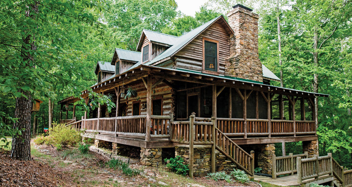 Hollett found a willing kindred spirit in local cabin builder Kevin Thomas, who undertook the job in 2008. A year later, Hollett; her husband, David; and their two grown sons were sitting, swinging, and enjoying the view on the three porches that wrap around the cabin. One is filled with rockers decorated with team colors and logos from every school that family members have attended. Another porch’s wall bears a battered thermometer that once hung on a nail in a tobacco barn: “Yellowing, Fixing, Drying, Scorching,” it says beside ascending temperatures.