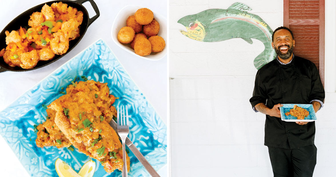 His recipes are all his own, including — “probably the favorite” — The Dougie, named for his best friend’s late brother. The Dougie is a crawfish and crabmeat gravy over a polenta cake, topped with a fried fish and more of that gravy goodness. At the moment, Hayes’s favorite fish to cook is Chilean sea bass. A Jamaican vacation inspired him to tinker with spices, and now, he’s doing whole red snapper in a jerk sauce made with Dr Pepper and orange juice: “The carbonated soda cuts through the heat.”
