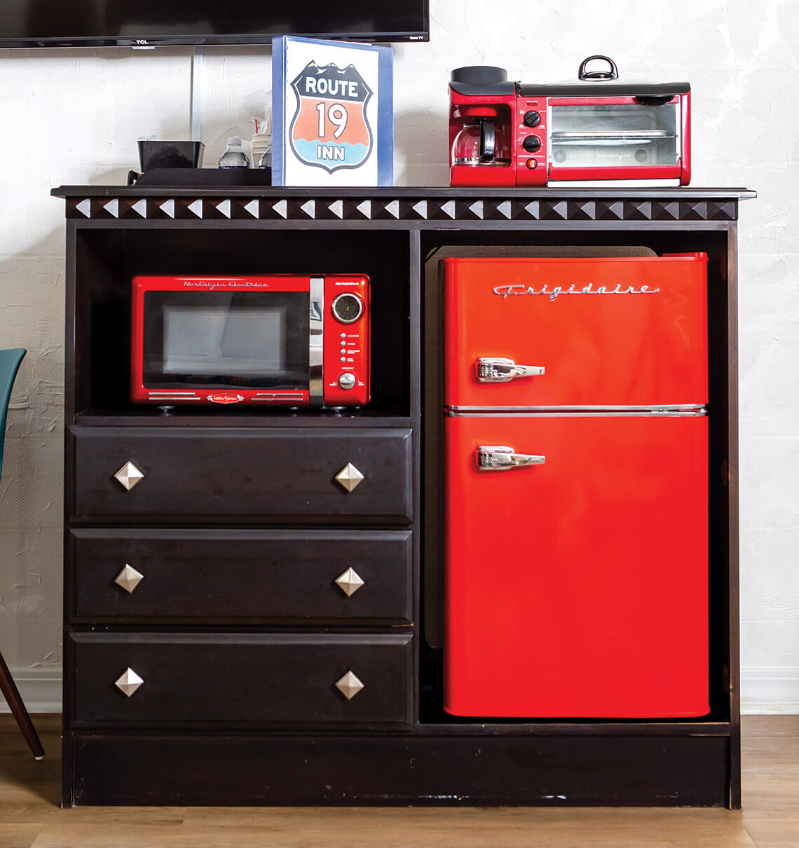Rooms are decorated to make them feel like they’ve checked into a motor lodge from the 1950s — if only those accommodations from yesteryear included microwave ovens and in-room coffee makers. photograph by Tim Robison