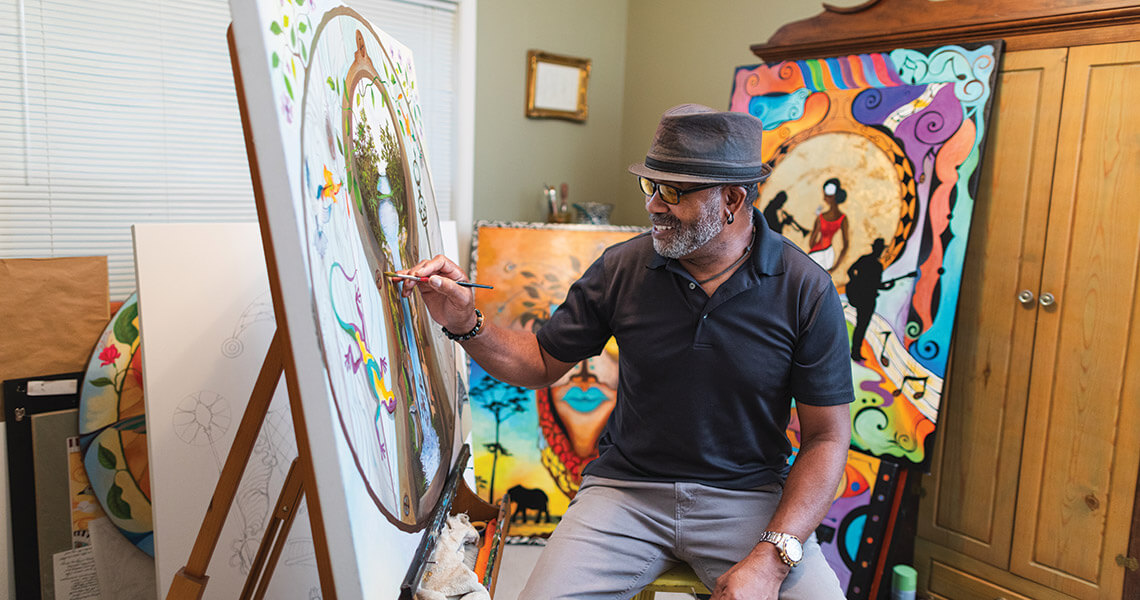 “People ask me all the time, ‘You have a lot of stuff with music in your pieces, and you’ve got a great voice — do you sing?’ I’m like, ‘No, but I love jazz,’” Hatcher says in a deep and resonant voice that could’ve launched a career for him as a DJ on a jazz radio station had he not chosen to paint the music instead. “People ask me, ‘Do you paint to it?’ Yeah, I do,” he says, nodding to a boom box tucked beneath his easel in his cozy home studio in Monkey Junction, just south of Wilmington. “There’s an energy about jazz. There’s something about the creativity of jazz, the way it comes together. I think that’s what I really love.”