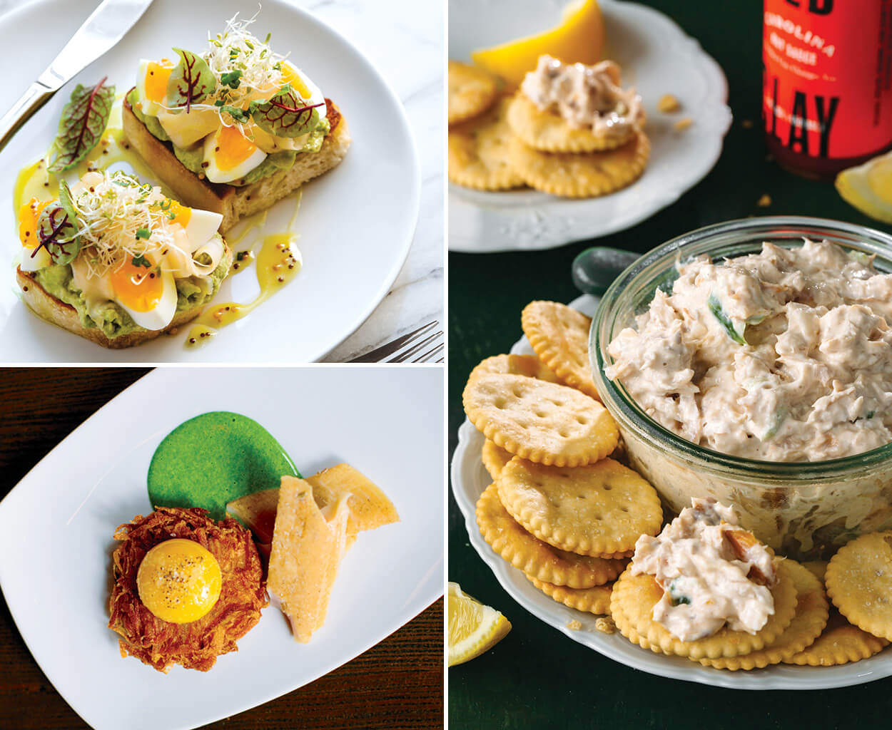 Smoked trout three ways: on seasonal toasts at Postero in Hendersonville; whipped into a dip at home; paired with an olive oil-poached yolk as Latke Benedict at Littler in Durham. photographs by Jack Sorokin