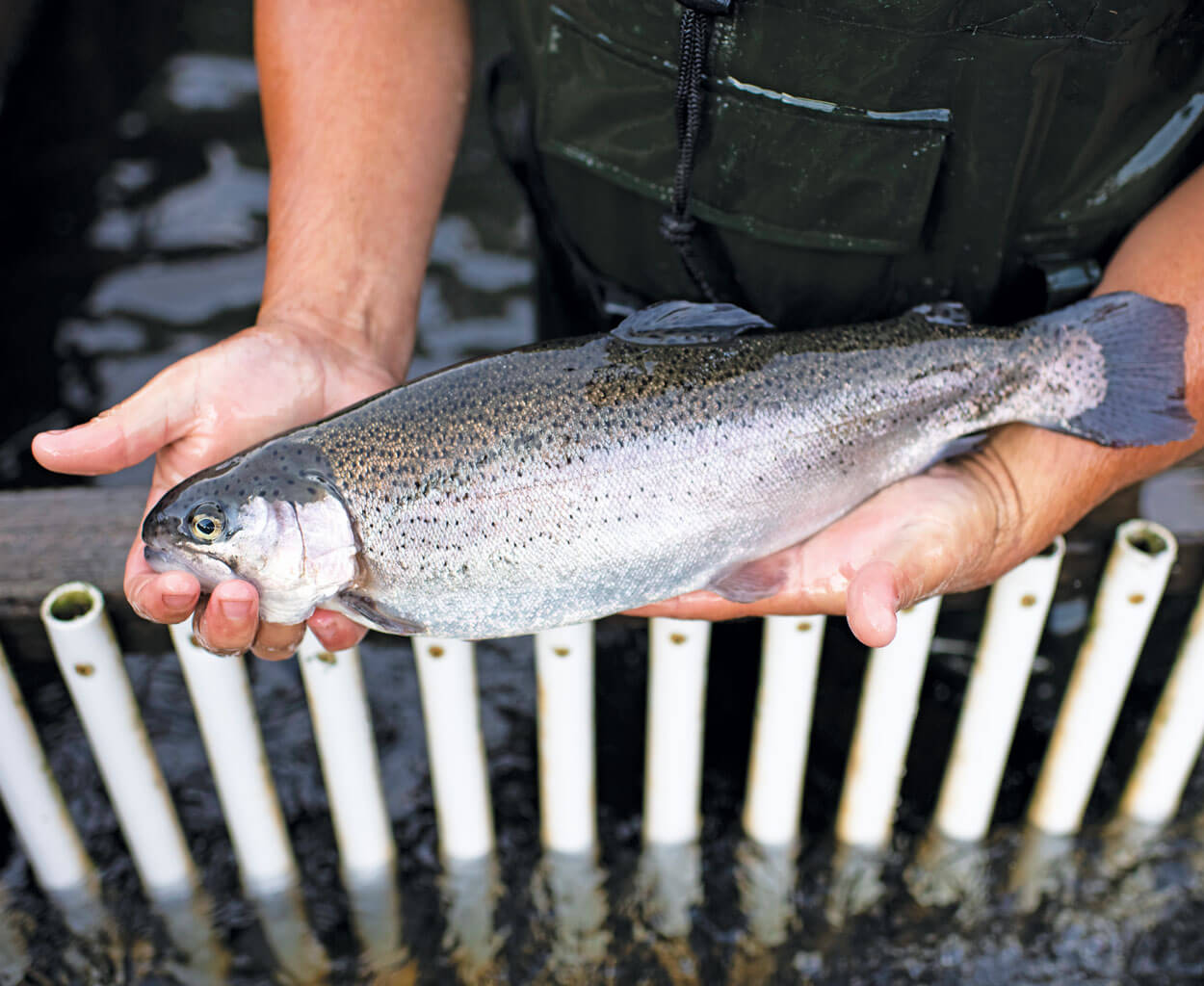Sunburst trout spend about 18 months swimming against the current and eating sustainable feed before going to market. photograph by Jack Sorokin