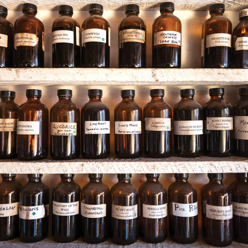 The back door of the apothecary has the gentle curves of a hobbit house. Its shelves are crooked and overcrowded with books — some of them priceless, out-of-print jewels — about Chinese herbs, Asian gardens, and Appalachian medicinals. In the work area, where herbs are turned into remedies, a mortar and pestle sits dormant on an enamel tabletop. On shelves above are blue bottles of tinctures and jars filled with the dry herbs used to make them. Skeletal seed pods hang from string.The scene is straight out of a storybook, doused with magic.
