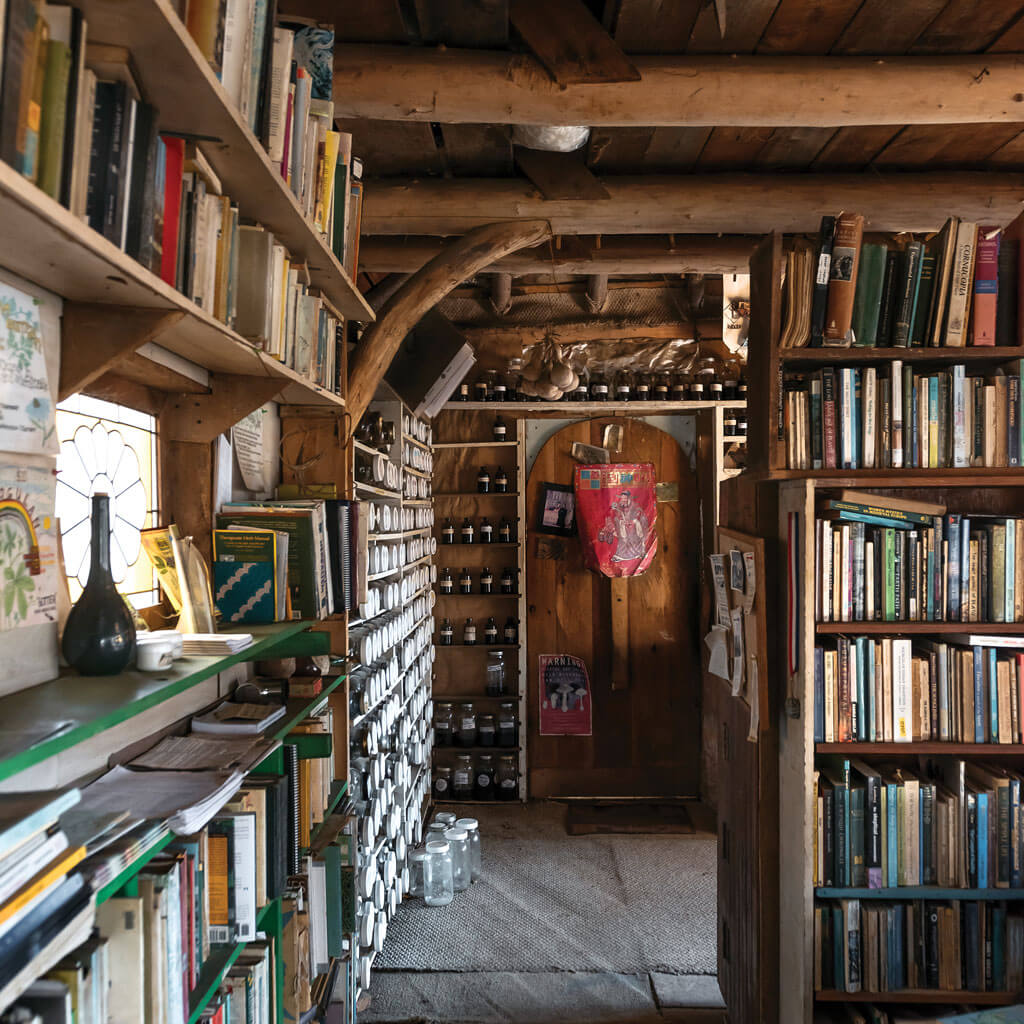 Ancient knowledge lines the shelves of Hollis’s apothecary in the form of rare and out-of-print books. Here, he crushes herbs, roots, and seeds to make healing tinctures. photograph by Jack Sorokin
