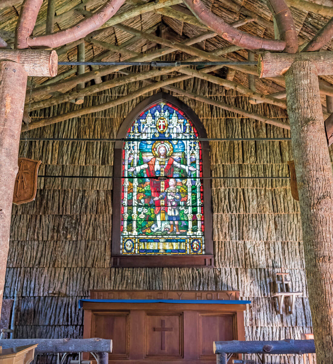 The type of bark-and-branch design used in Linville’s All Saints Episcopal Church inspired Marty and Chris McCurry’s business, Bark House. photograph by Emily Chaplin