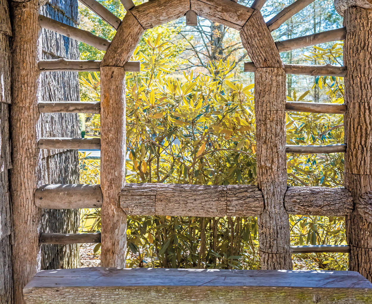 The use of tree bark in architectural design is an ancient tradition because it’s sturdy, long-lasting, and expressive. But the style of this particular shingle — square, deeply ridged, with a smooth edge — traces its roots to the late 1800s and the town of Linville and the surrounding mountain communities: Grandfather, Grandmother, Pixie, and Flat Rock among them. The area was so remote that it was once referred to as the state’s “lost provinces.” On Linville’s quaint streets, many of which are named for native trees, almost every bungalow, cottage, and grand manor — and some interior walls as well — is now enveloped in a clean-edged bark shingle. The look defines the town: Bark-covered branches embellish garden archways, footbridge handrails, even birdhouses. In the center of town, guests at the historic Eseeola Lodge relax on porches and stroll under arbors that embody Linville’s affinity for wrapping itself in trees.