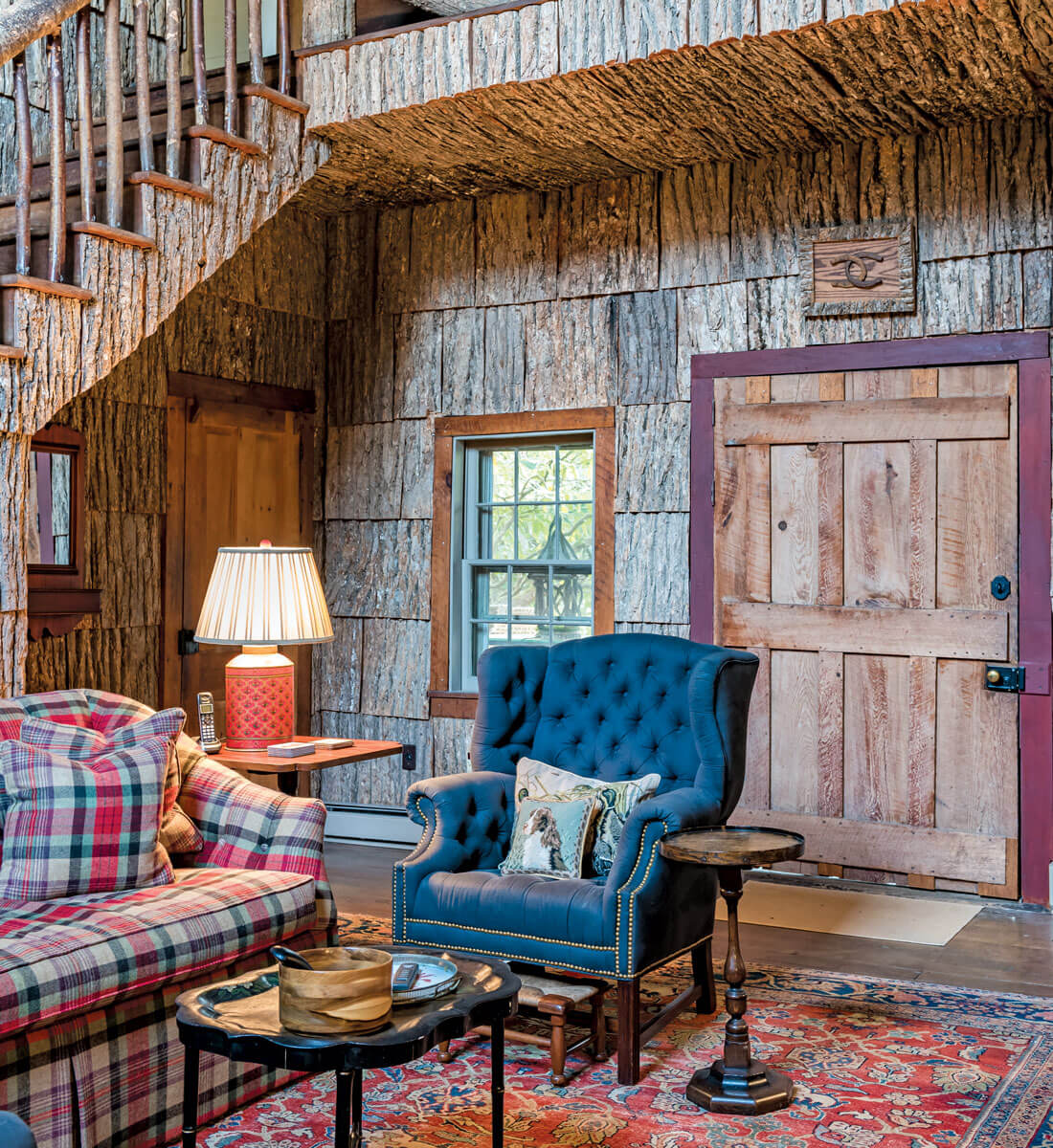 The McCurrys’ Bark House headquarters is down the road from Linville, on Main Street in Spruce Pine. It’s a touchable warren of hallways and rooms covered in richly textured bark, roots, and twigs. Even the restroom feels like the cozy inside of a stump on a pine-scented ridge.