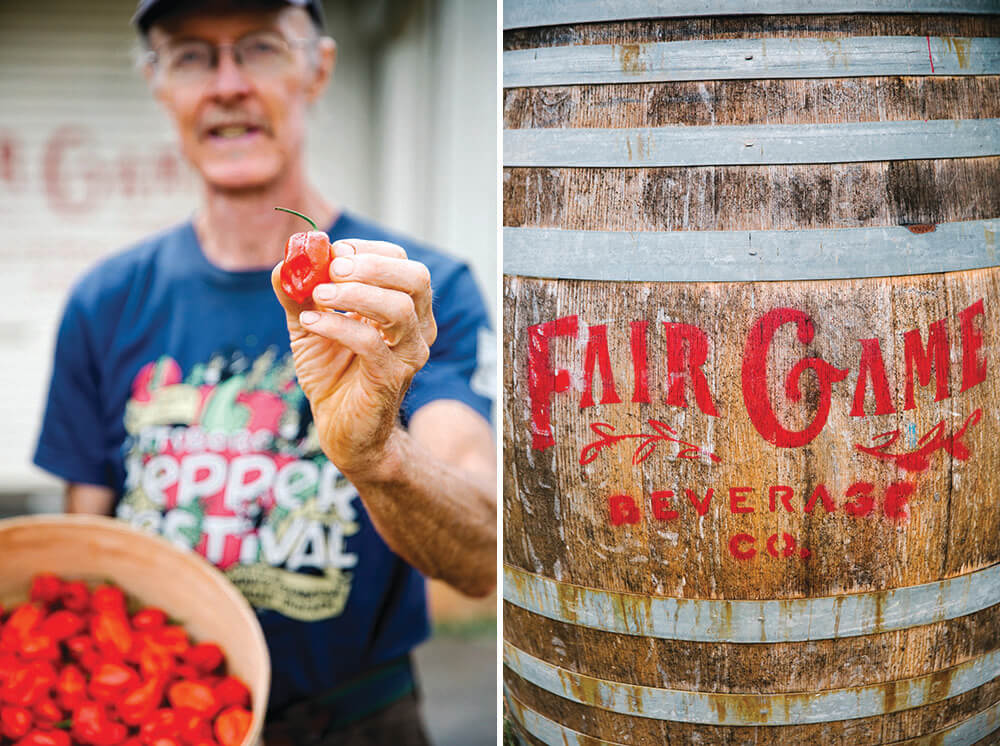 Sweet-and-smoky ají dulce peppers developed by Mebane farmer Doug Jones, and a barrel Fair Game’s pepper vodka. photograph by Anagram Photo