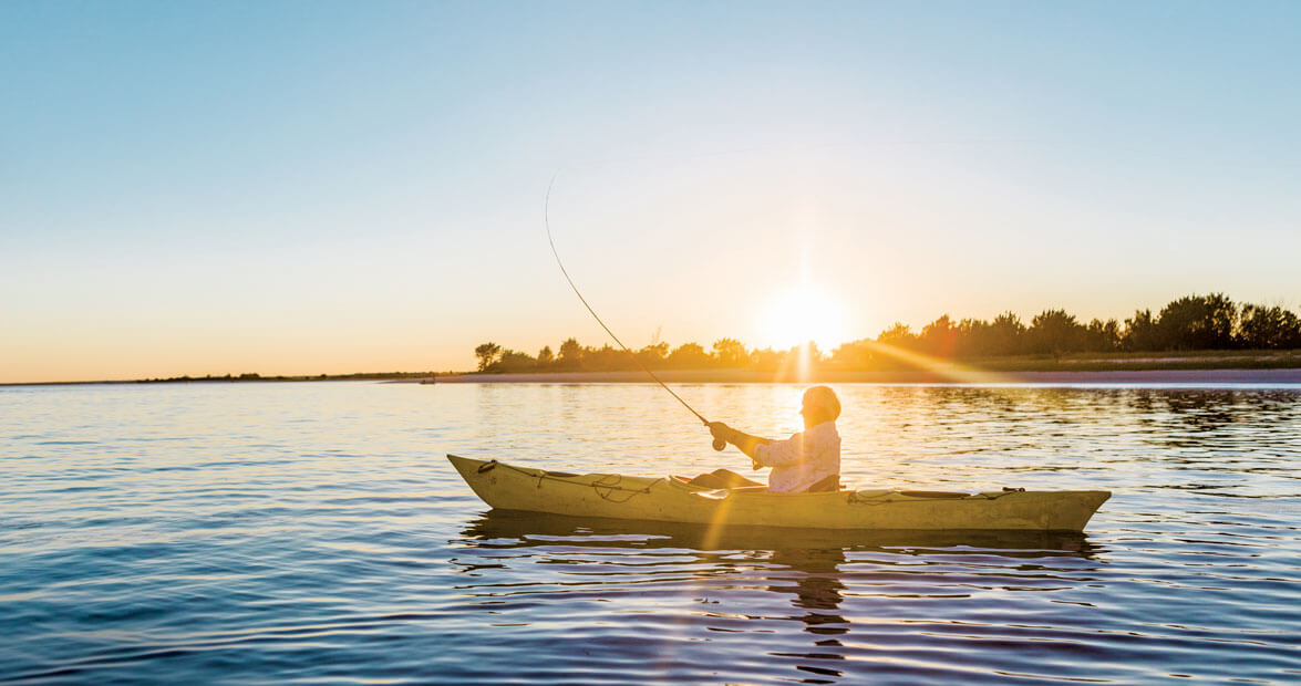 I stand knee-deep in water on the sound side of Wrightsville Beach, my left hand steadying a borrowed yellow kayak. In my right hand, I hold my trusty fly rod and reel. As for managing my equipment, if I have to, I’ll stick the reel end of my rod straight down my shirt back, at my neck, let the rod stand like an aerial while I paddle away. Then, when it comes time to fish, I’ll just lay the paddle across my stomach, grab the rod over my shoulder like an arrow from a quiver, and cast away. What could go wrong?