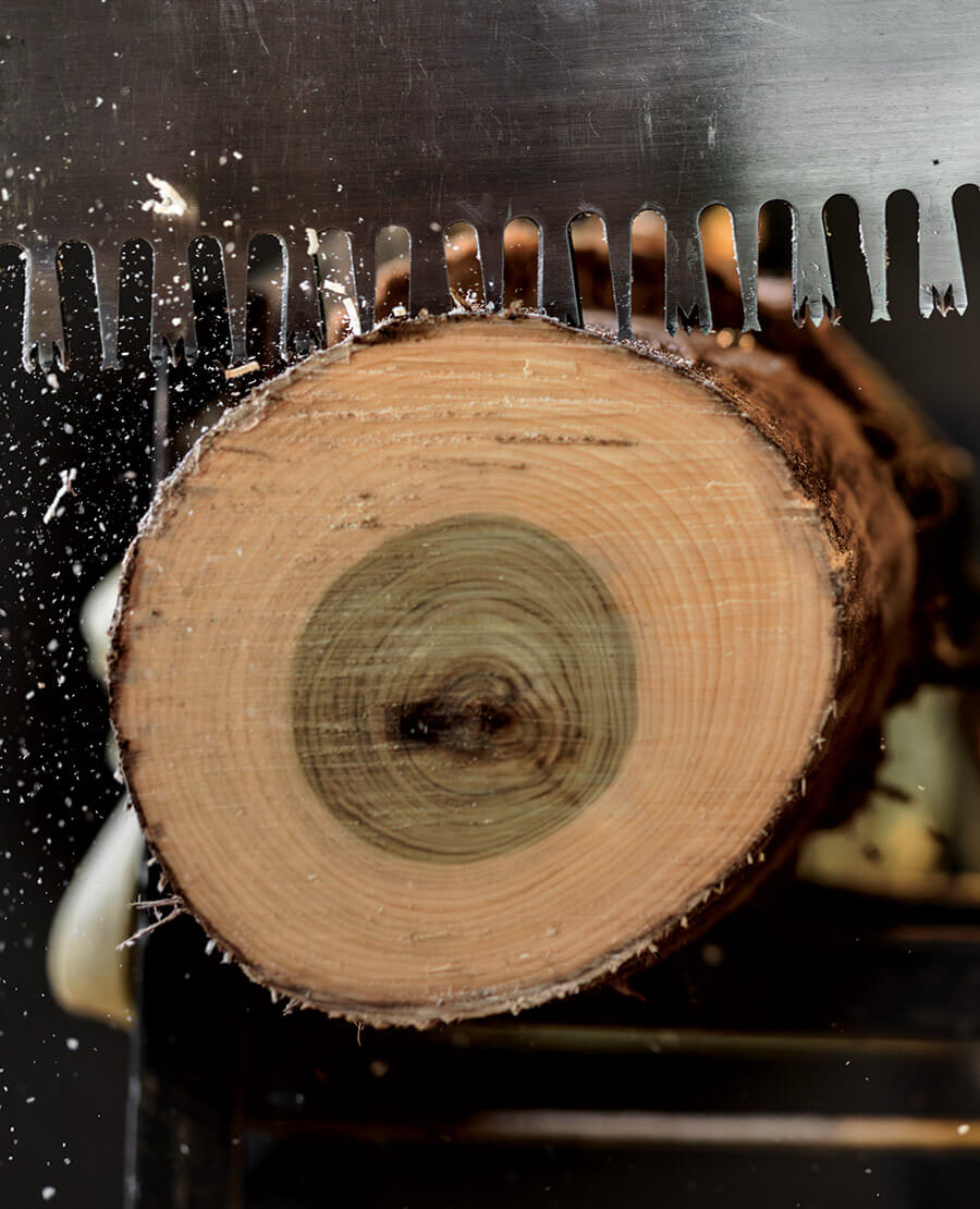 Students train to practice events like the Double Buck, in which two people use a crosscut saw to cut through a log as fast as possible. photograph by Scott Muthersbaugh