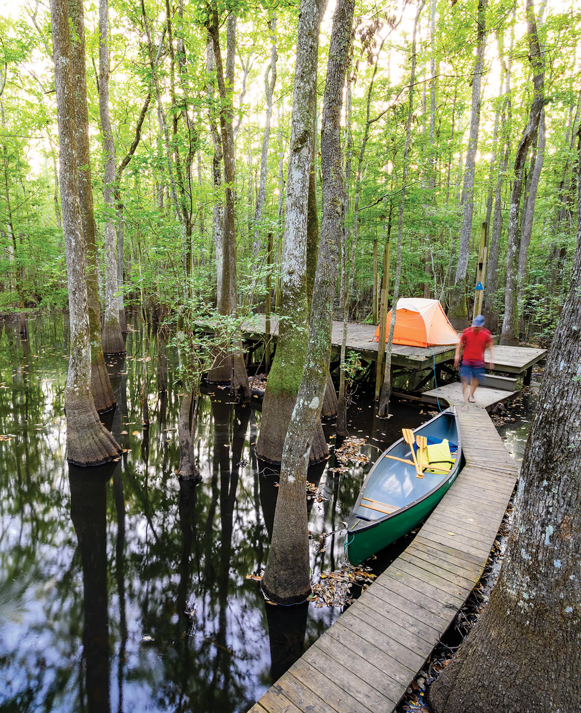 Deep in the drowned cypress and gum wilds of Devil’s Gut, a long distributary that leaves the main Roanoke channel and then rejoins it above Jamesville, the visionary Roanoke River Partners built its host of tent-camping platforms 20-odd years ago, including Beaver Tail and Beaver Lodge, which is, in a manner of speaking, way out yonder where there ain’t nobody never is. When the climate allows, spend an evening or two visiting with at least one parliament of barred owls. For more information, visit roanokeriverpartners.org.