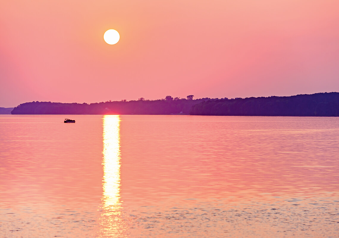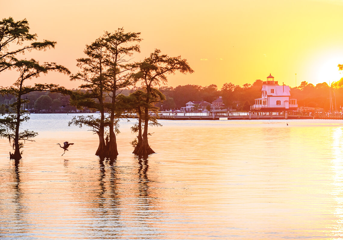 Out in Edenton Bay, you can watch the sun set over the old sound-and-river lighthouse. photograph by Emily Chaplin and Chris Council