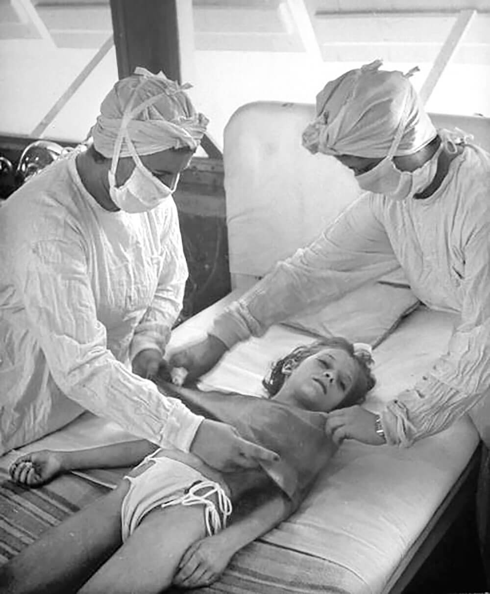 Medical staff apply Kenny treatment massage and hot packs — named for crusading Australian bush nurse Sister Elizabeth Kenny — to a young patient. photograph by Alfred Eisenstaed/The Life Picture Collection/Getty Images