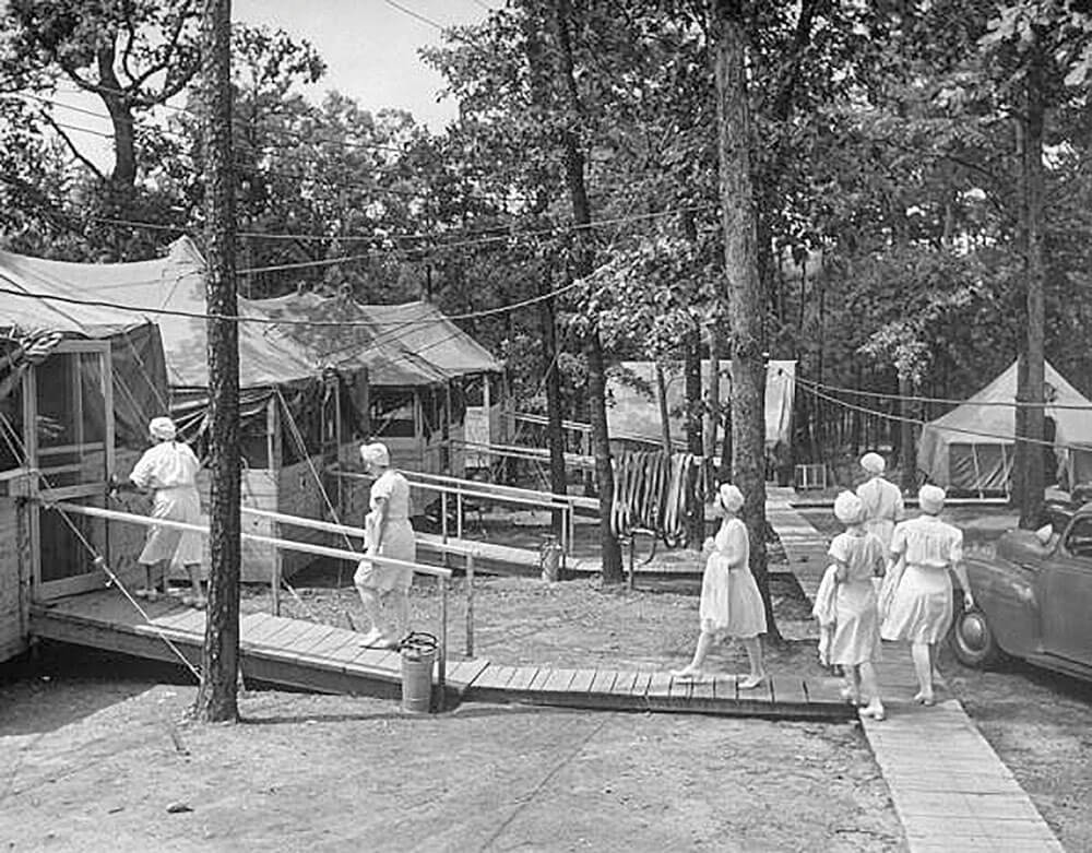The three doctors each take on clearly defined duties: Dr. Whims supervises renovating the camp as a hospital and adding wards — first Army tents, and later, more durable wooden structures connected by boardwalks. Dr. Hahn finds supplies and equipment. Crabtree uses his national contacts to secure funds and recruit staff from all over the United States. Within weeks, the hospital fields a remarkable cadre of doctors, nurses, and therapists from cities like Winston-Salem, Philadelphia, and Chicago, and medical schools at Harvard, Yale, Johns Hopkins, and elsewhere.