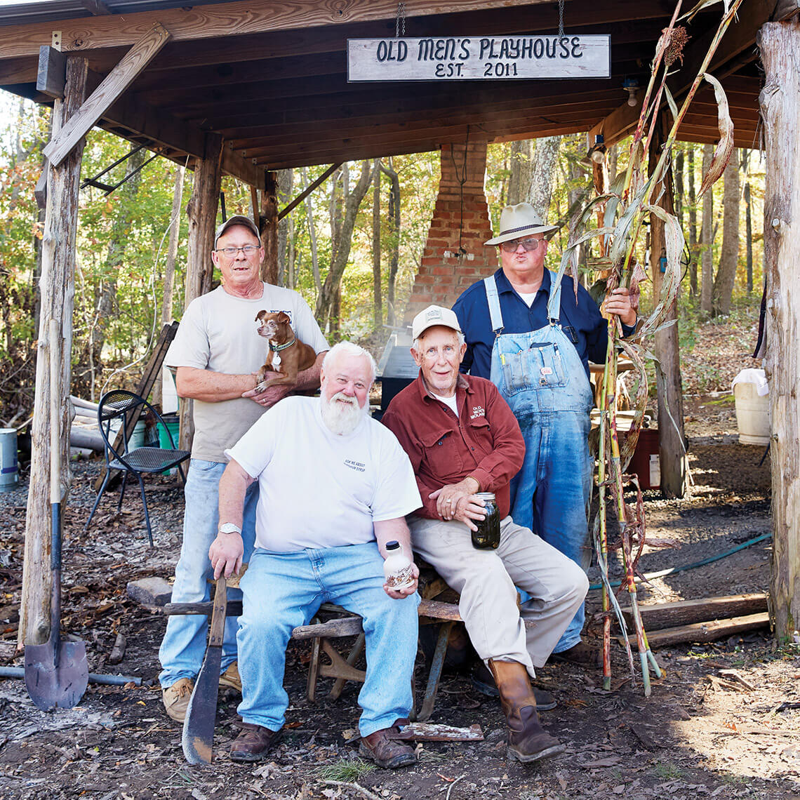 The men behind “Old Men’s Molasses” include (from left) Lonnie McLeod (with London the dog), Randall Berrier, Gilbert E. Futrell, and Ollie Shaw. photograph by Stacey Van Berkel
