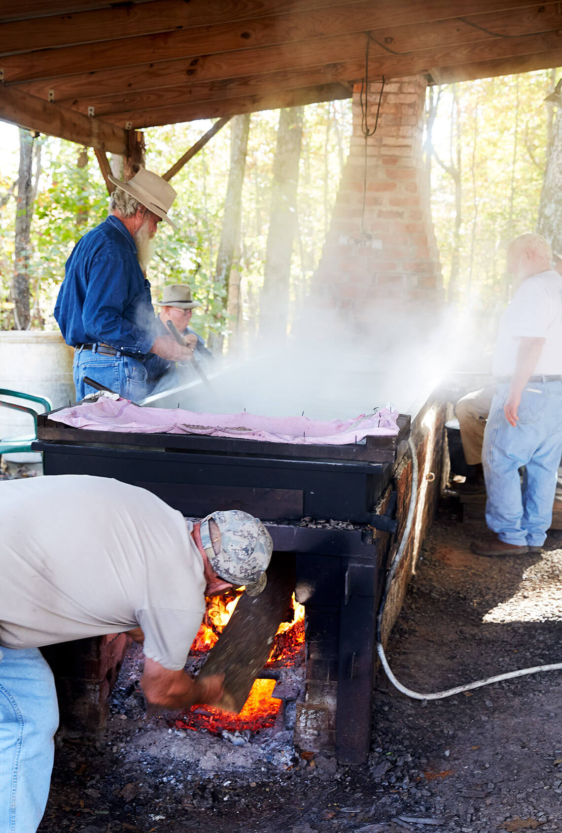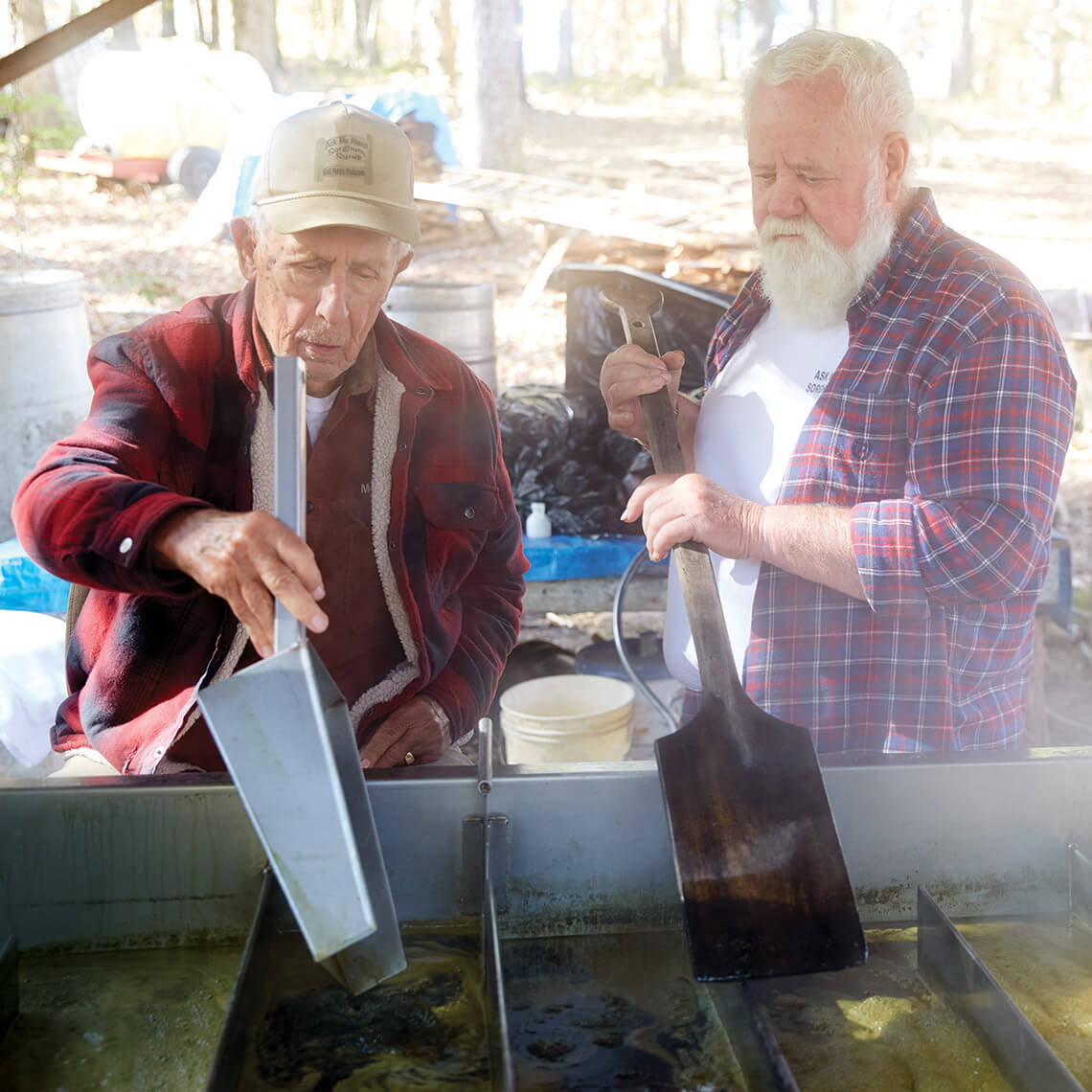 Futrell sits in the driver’s seat, a chair stationed at the far end of the pan. Four other men stand alongside the pan with paddles, stirring and skimming off the chlorophyll that rises to the top. One man feeds the fire box. Steam rises from the liquid and condenses underneath the shed’s tin roof. As the juice travels the length of the pan, it turns from muddy green to golden brown. Bubbles on the surface grow from the size of “fish eyes” to “hog eyes.”