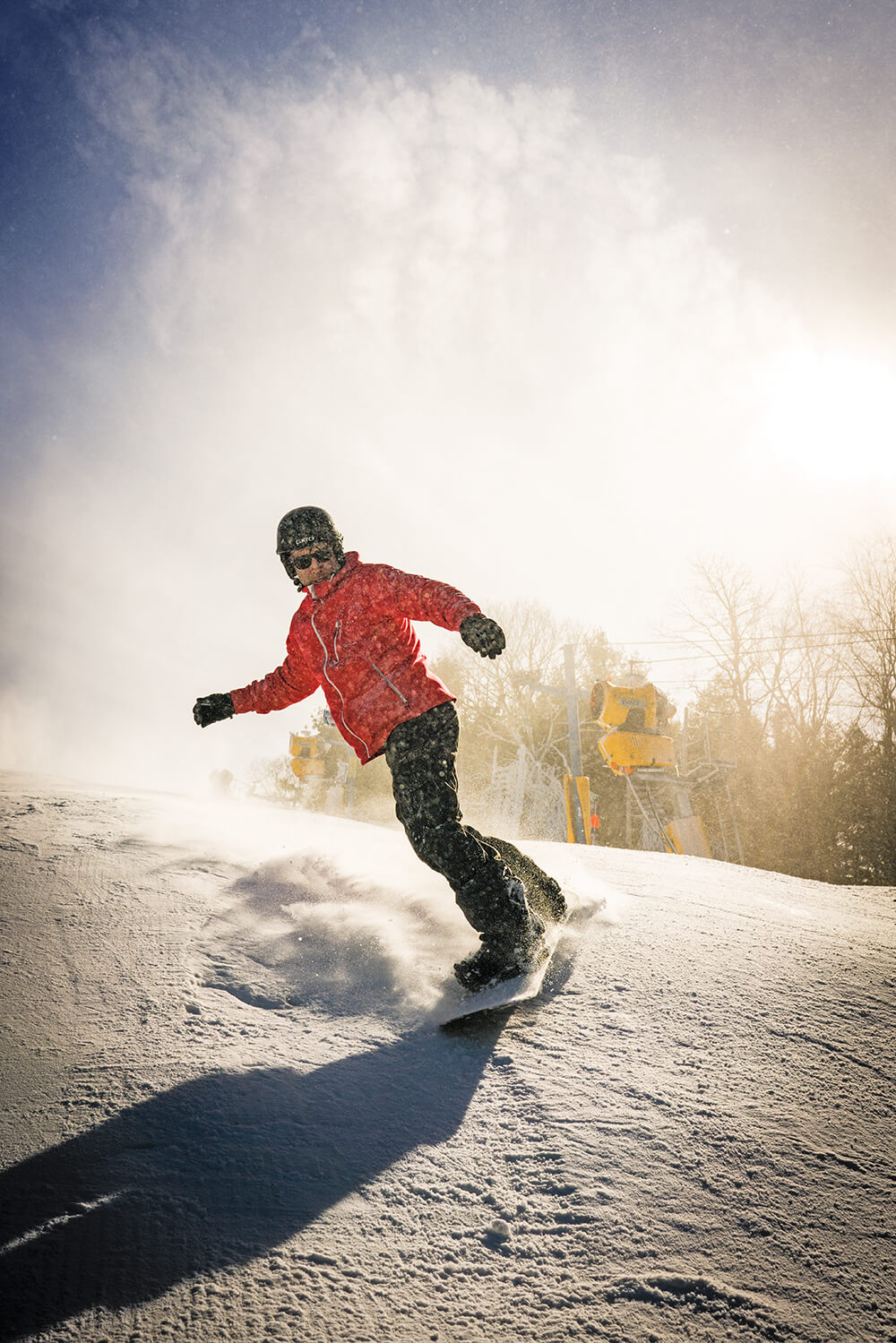 Snowboarders like Justin Keefe get a jump on the slopes thanks to man-made snow on Cataloochee’s Upper Omigosh run. photograph by Derek Diluzio