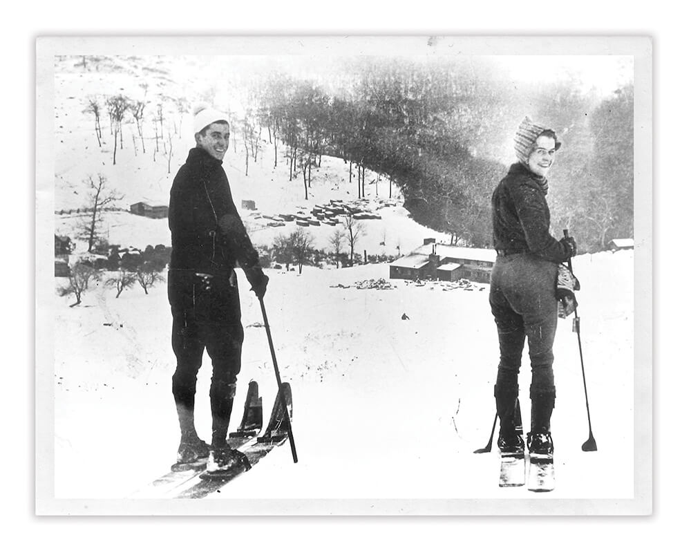Skiing the pastures of Cataloochee Ranch in the 1940s inspired North Carolina’s first ski resort. Cataloochee matriarch “Miss Judy” Alexander (right) and a ranch hand prepare for their descent on homemade skis using golf clubs for poles. photograph by Cataloochee Ski Area