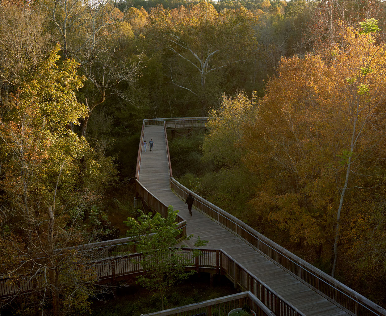 The path runs for three miles through town here, passing nest-like structures by artist Patrick Dougherty as well as the site of the former Occoneechee Speedway.